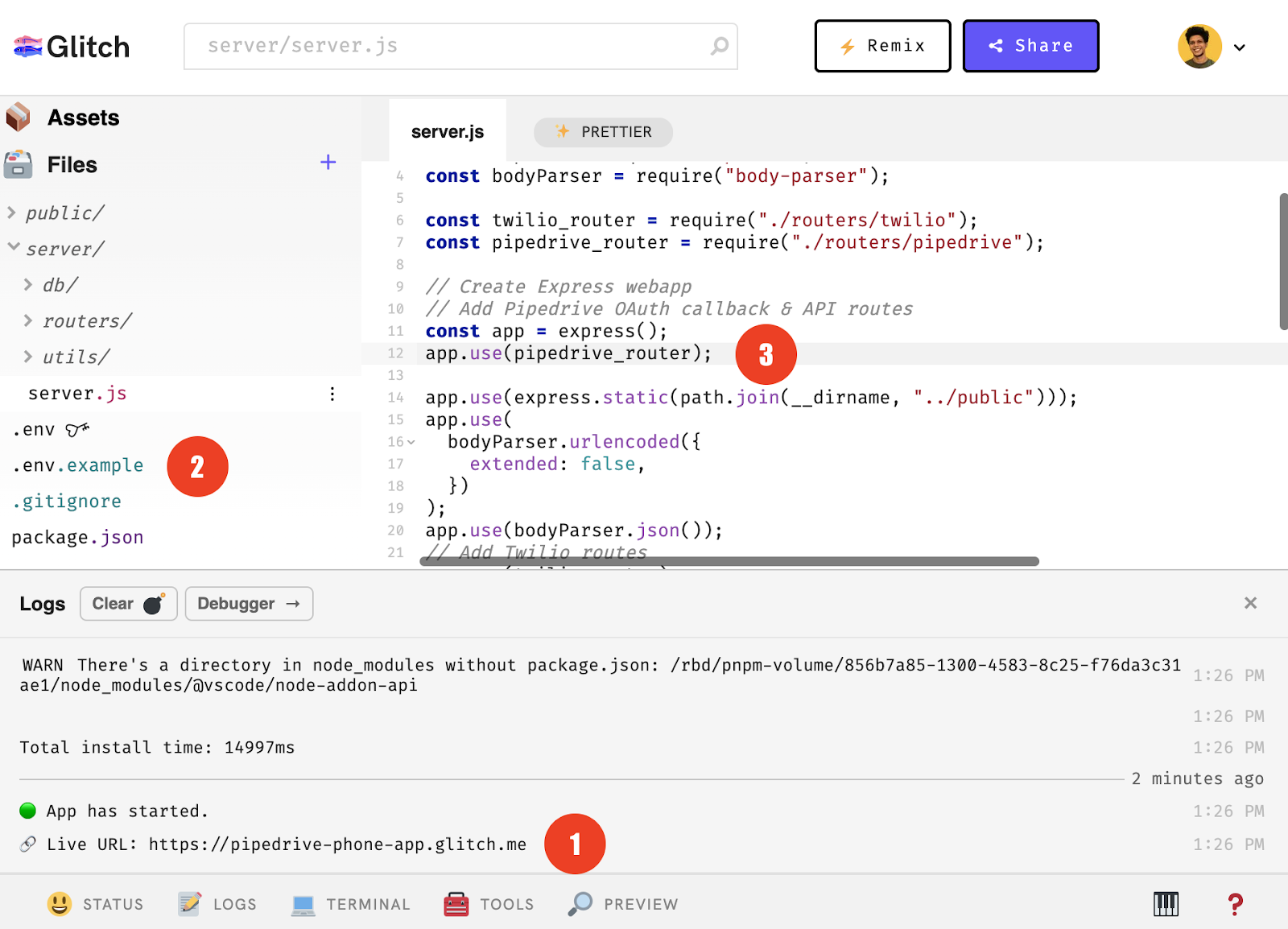Once you have remixed the app, you need to wait for a couple of minutes to let Glitch prepare the environment. You can click on the Logs tab in the bottom footer to see the console logs. If you see a message saying that the `π’ App has started` as indicated by red circle 1 in the image below, it means that the boilerplate app is ready π